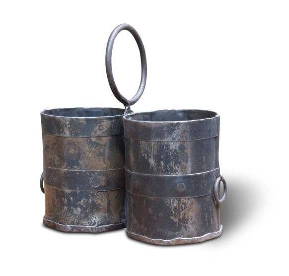 Gamle dobbeltdåser med håndtag til opbevaring af blomster, flasker, bestik og alt andet, du kan tænke på. En rustik patina giver denne vare prikken over i'et. Også god at bruge udendørs.