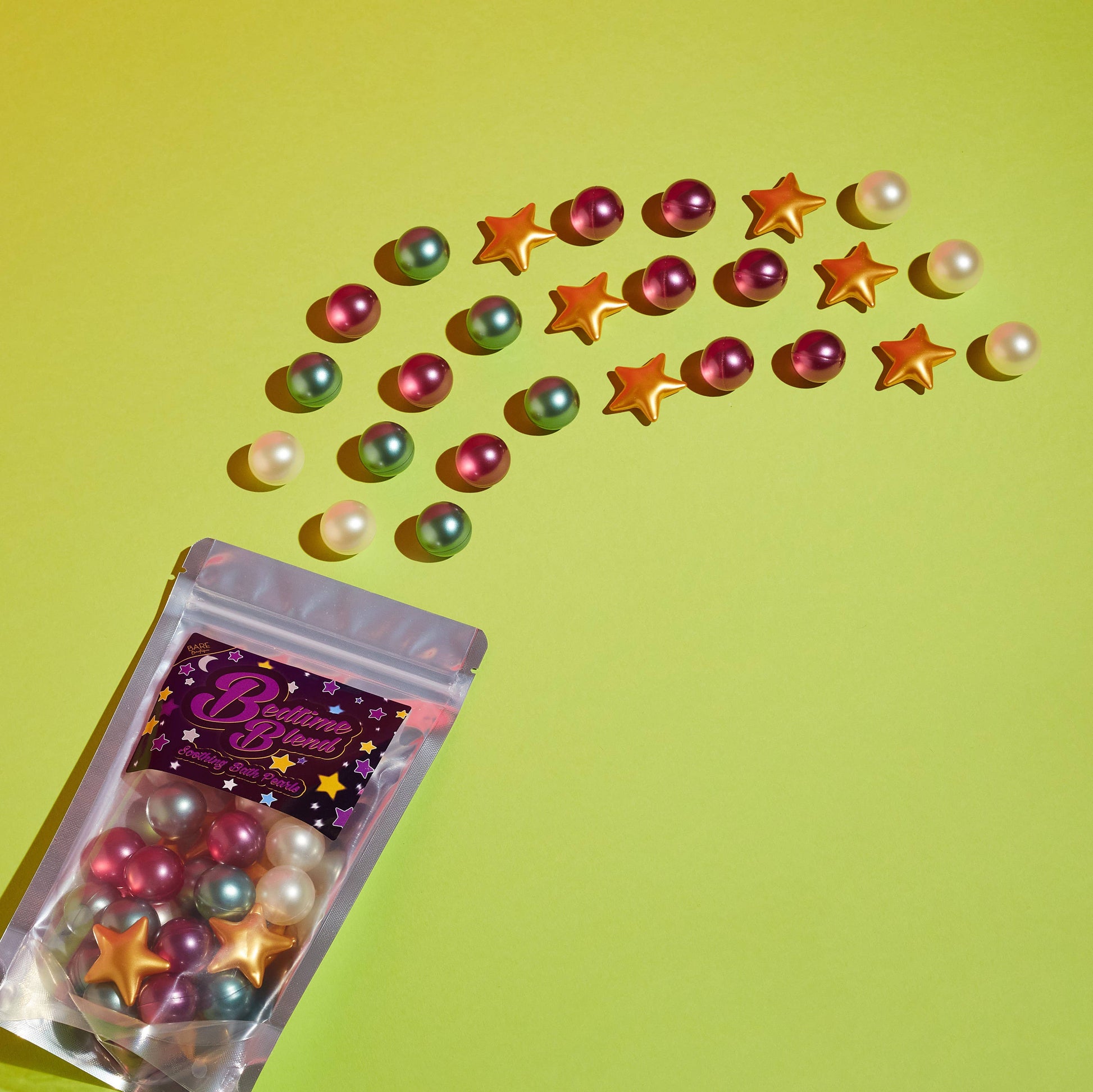 Bedtime blend udgaven er en pakke med 30 blandede badeperler i forskellige former og farver med hver sin unikke duft. Flere forskellige ass. former/ varianter stjerner, perler og kugler i forskellige dufte.