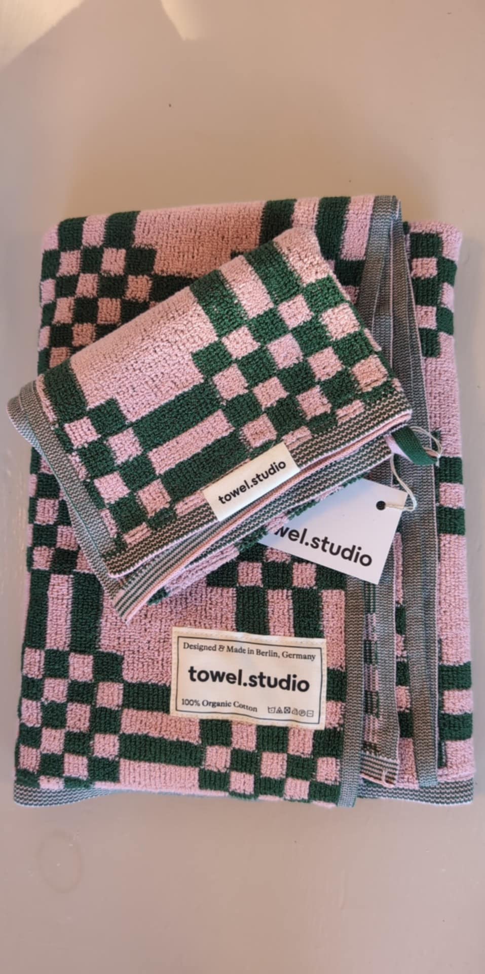 1 Gæste håndklæde: 50 x 50 cm i lyserød og mørkegrøn