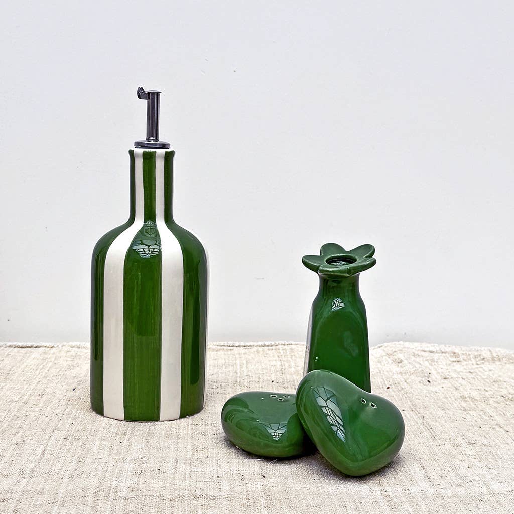 Stribet stentøjsolieflaske med en praktisk og funktionel hældetud.