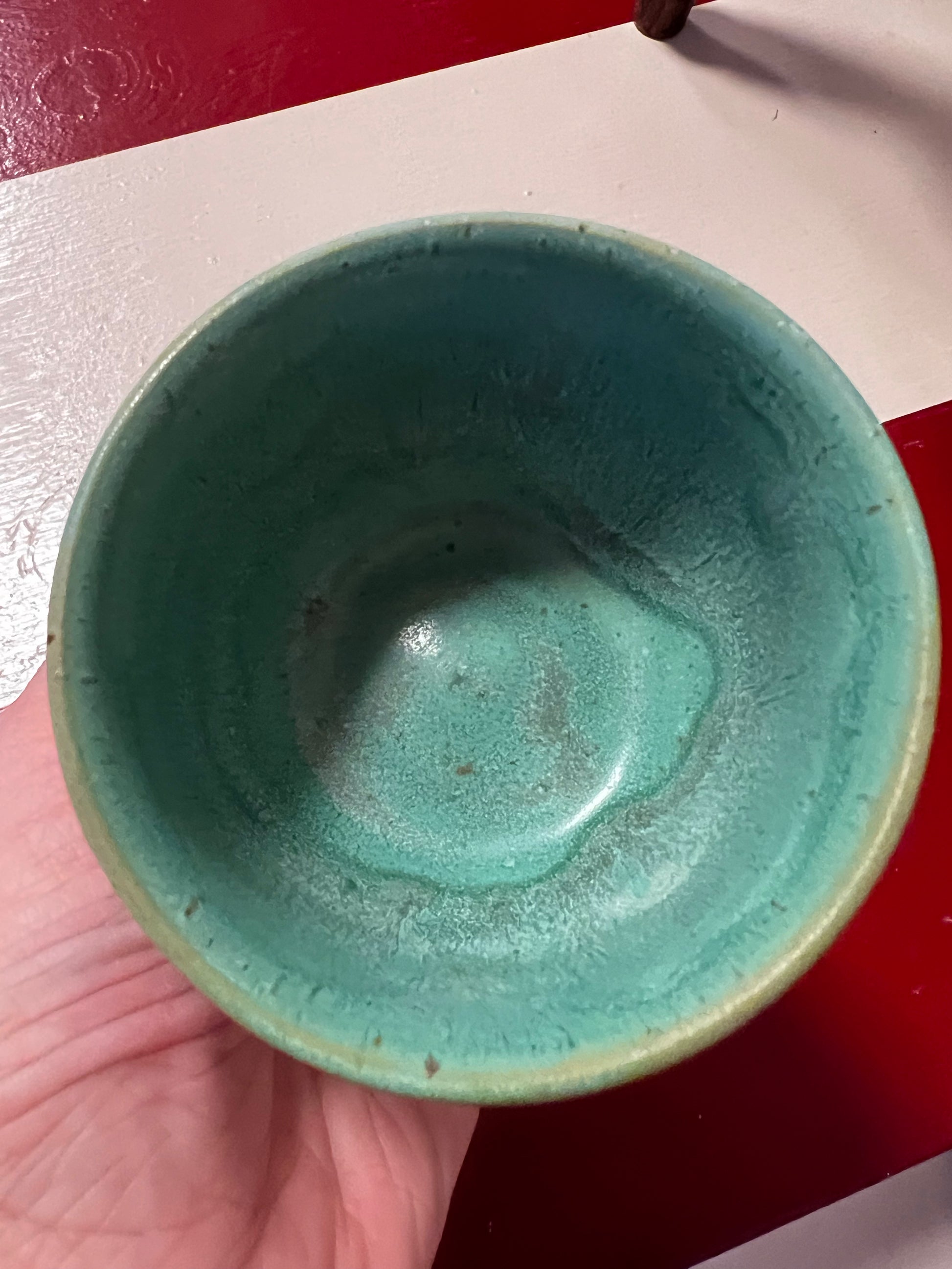 Indersiden er noget helt særligt: en dyb, levende jadegrøn/turkis glasur, der flyder smukt og organisk, så farven ændrer karakter alt efter lys og vinkel. Den giver koppen et frisk, kunstnerisk og næsten magisk udtryk – som et lille farveunivers, man kigger ned i, hver gang man tager en slurk.