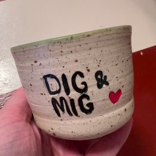 En håndlavet keramik-kop, der emmer af nærvær og små hverdagsøjeblikke. Ydersiden har den klassiske rå, sandfarvede overflade med naturlige små brune speckles, som giver koppen et autentisk og nordisk udtryk. På forsiden står teksten “DIG & MIG” i blank sort skrift – afsluttet med et lille rødt hjerte, der gør den perfekt som gave til en partner, bedste ven, søskende eller en, der bare betyder ekstra meget.