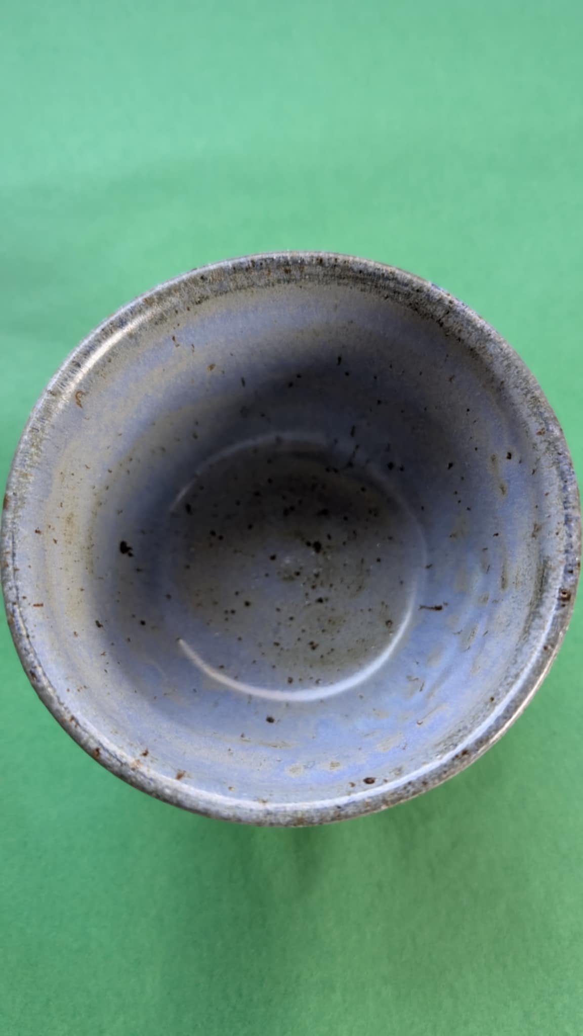 En håndlavet stentøjskop med et råt, beige ydre, hvor små prikker og struktur giver den et varmt og naturligt udtryk. På forsiden står den fine tekst “DU GØR MIG RIG INDENI” i sorte, håndtrykte bogstaver, flankeret af små røde hjerter for et kærligt og personligt touch. Indeni er koppen glaseret i en blød, støvet blå tone med naturlige pletter, som giver harmoni mellem ydre og indre. Formen er rund, enkel og ligger perfekt i hånden – en lille kop fyldt med varme og betydning.