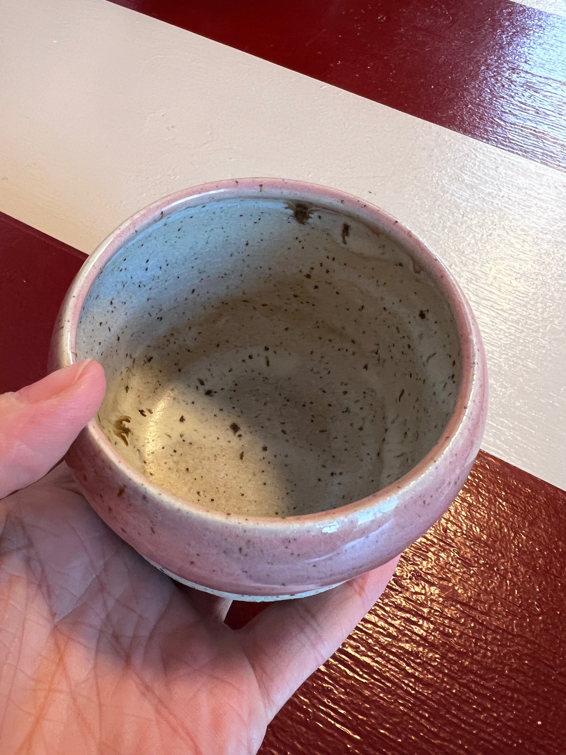 Indvendigt er koppen glaseret i lyse, beige og let plettede nuancer, der skaber et roligt og naturligt look. Formen er rund og blød med en skøn, fyldig feel i hånden.