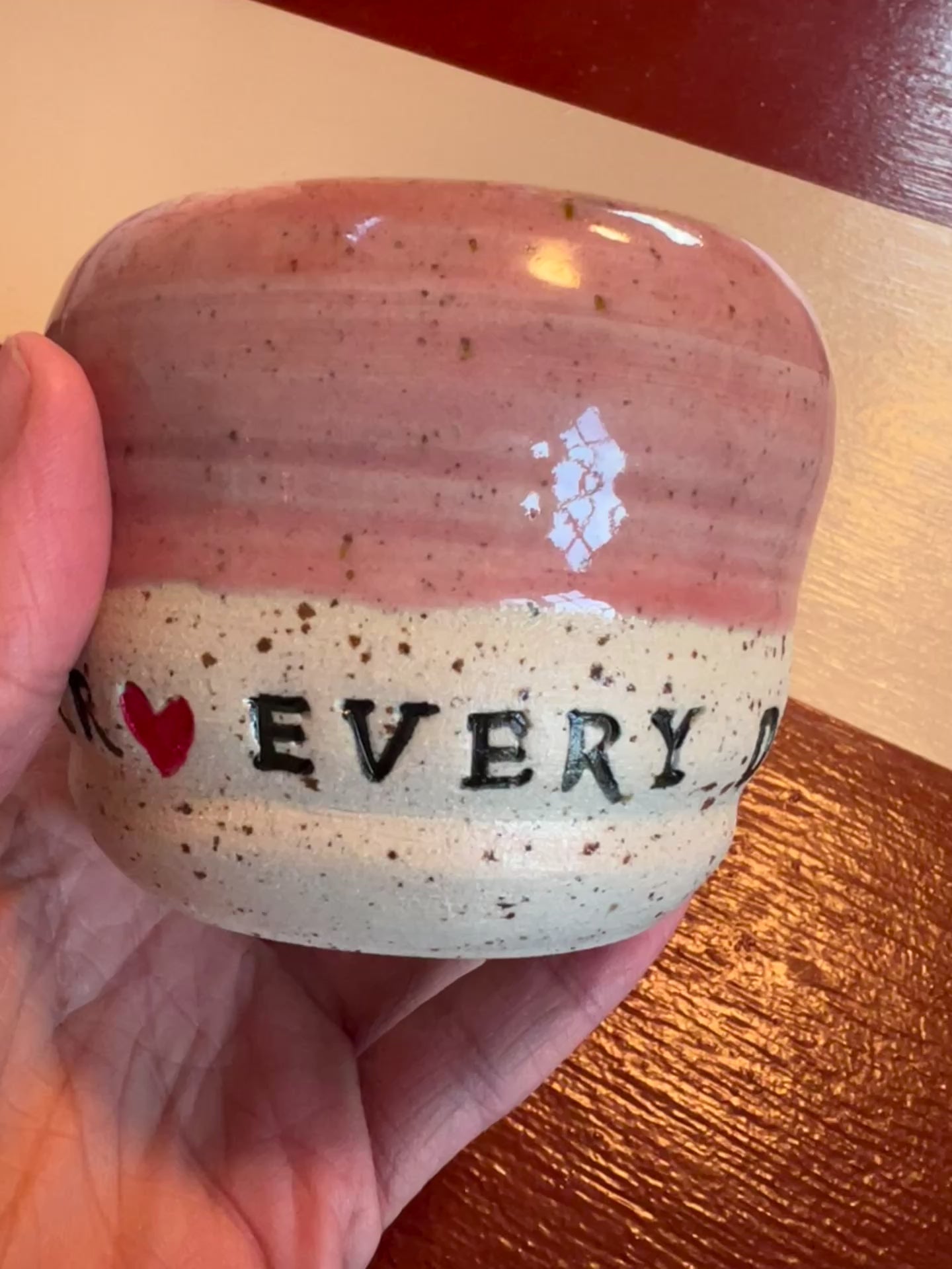 En charmerende håndlavet stentøjskop med en smuk, rosatonet glasur på den øverste halvdel, der giver et varmt og blidt udtryk. Nederst står den rå, sandfarvede keramik med små rustikke prikker og håndtrykt tekst – afsluttet med et rødt hjerte, der giver koppen et kærligt touch.