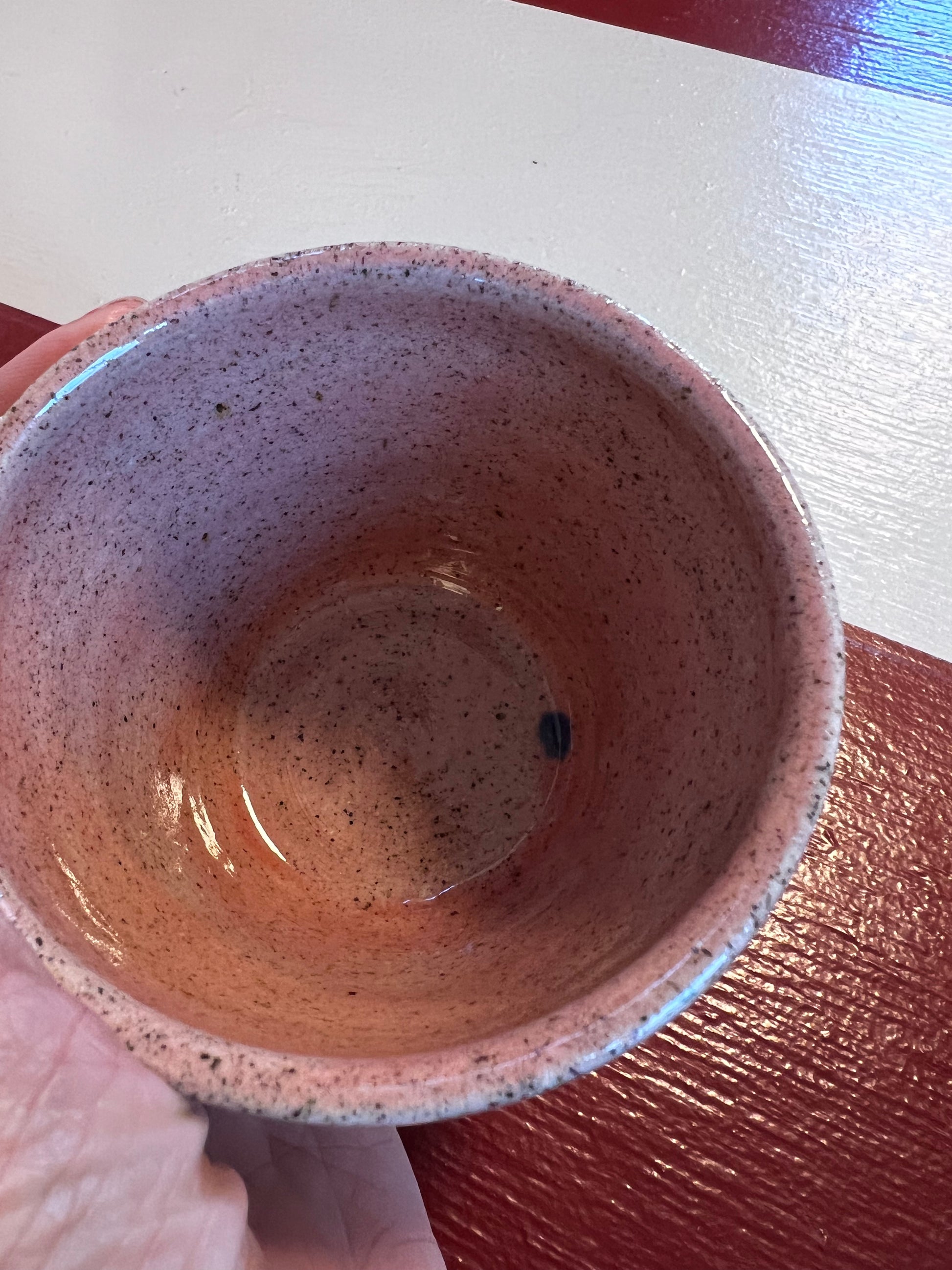 Indersiden er lige så charmerende som ydersiden: glat, rosa-speckled glasur, der giver et varmt og indbydende look, perfekt til kaffe, te eller kakao. Formen er enkel og behagelig at holde om, og hver eneste kop har sit eget præg af håndværk.