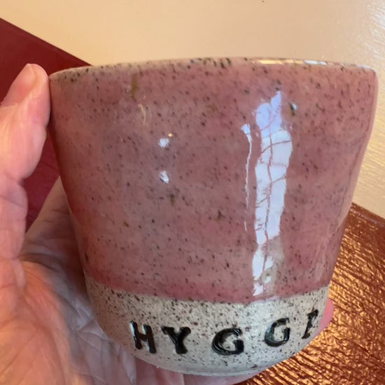 En håndlavet keramik-kop i de smukkeste, rolige nuancer. Den øverste del er glasert i en blød rosa farve med fine, naturlige speckles, der giver et organisk og unikt udtryk. Nederst møder den en rå, lys stenfarve, hvor ordet HYGGE er stemplet ind – som en lille påmindelse om langsomme morgener og varme stunder.