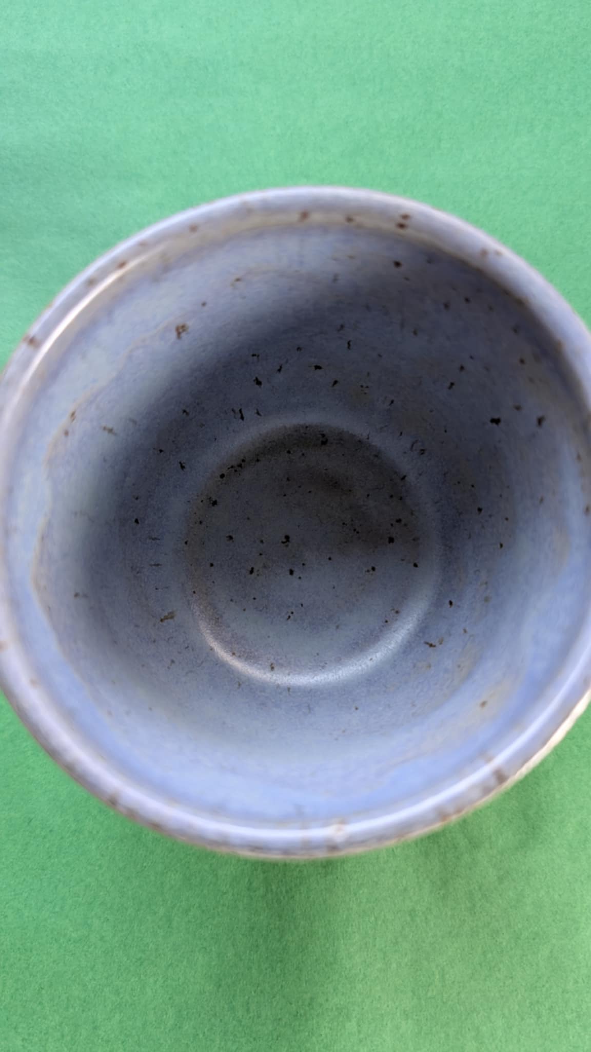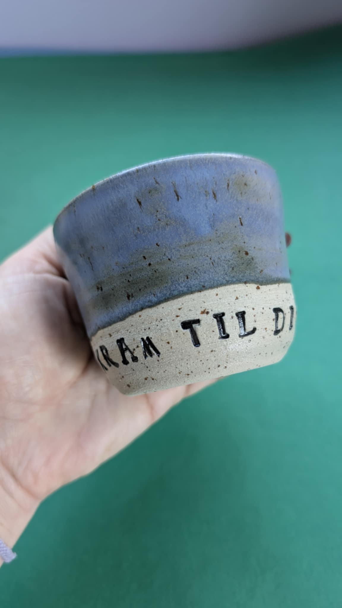 En hånddrejet stentøjskop med en smuk todelt glasur: øverst en blød, støvet blå tone med små naturlige prikker, og nederst et råt, sandfarvet stykke keramik med håndtrykte bogstaver. Teksten “KRAM TIL DIG” løber rundt om bunden i sort, hvilket giver koppen et kærligt, personligt og lidt legende udtryk. Indvendigt fortsætter den rolige blå glasur og skaber en fin helhed. En lille, hjertevarm kop – perfekt som en “to-go”-krammer til én, man holder af.