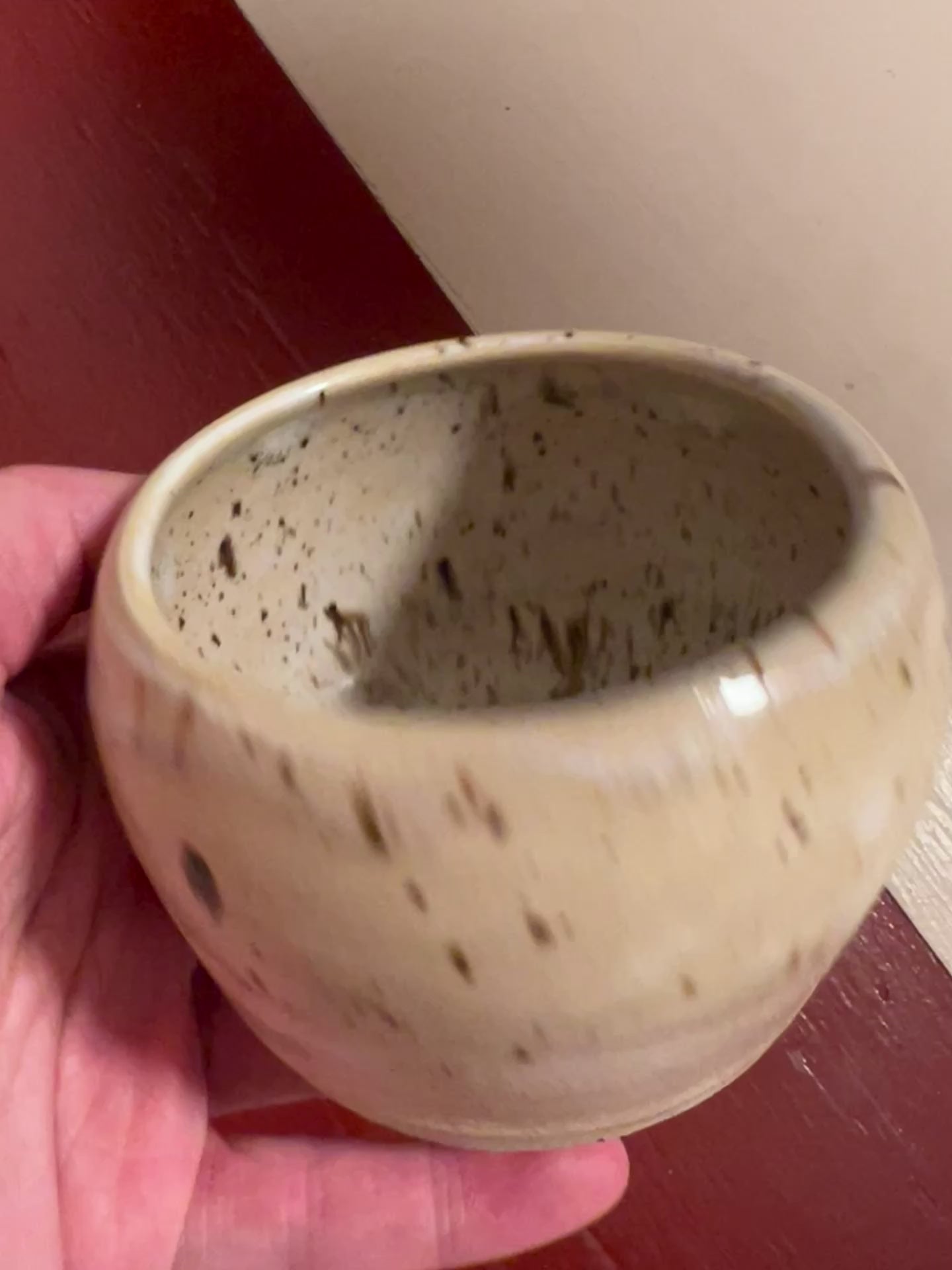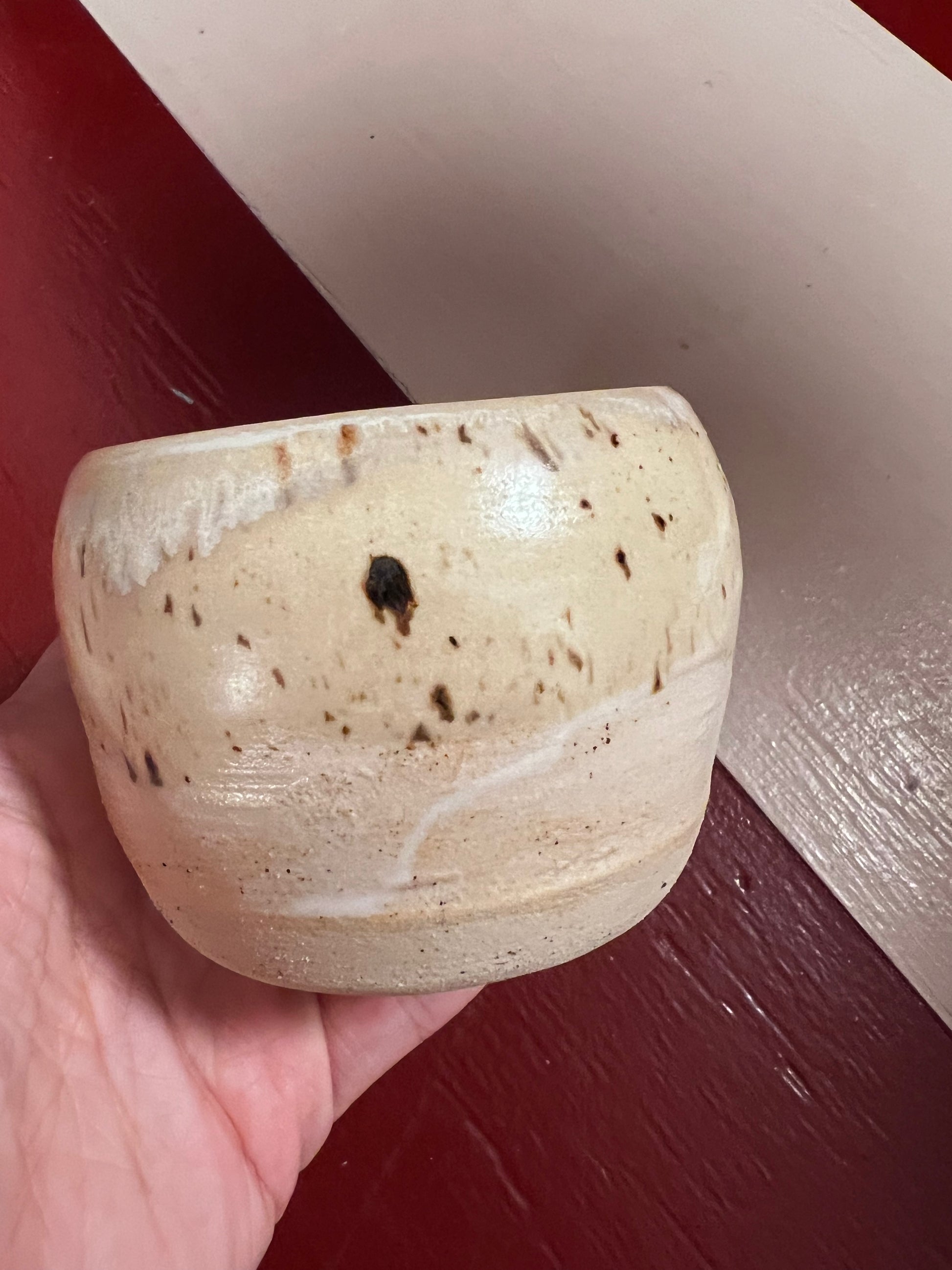 En elegant, håndlavet keramik-kop i varme, naturlige nuancer. Ydersiden har et blødt cremefarvet udtryk med fine, mørke speckles og lette, organiske glasurstrøg, der giver koppen et roligt og jordnært look. Den matte til halvblanke overflade gør den både moderne og klassisk på samme tid.