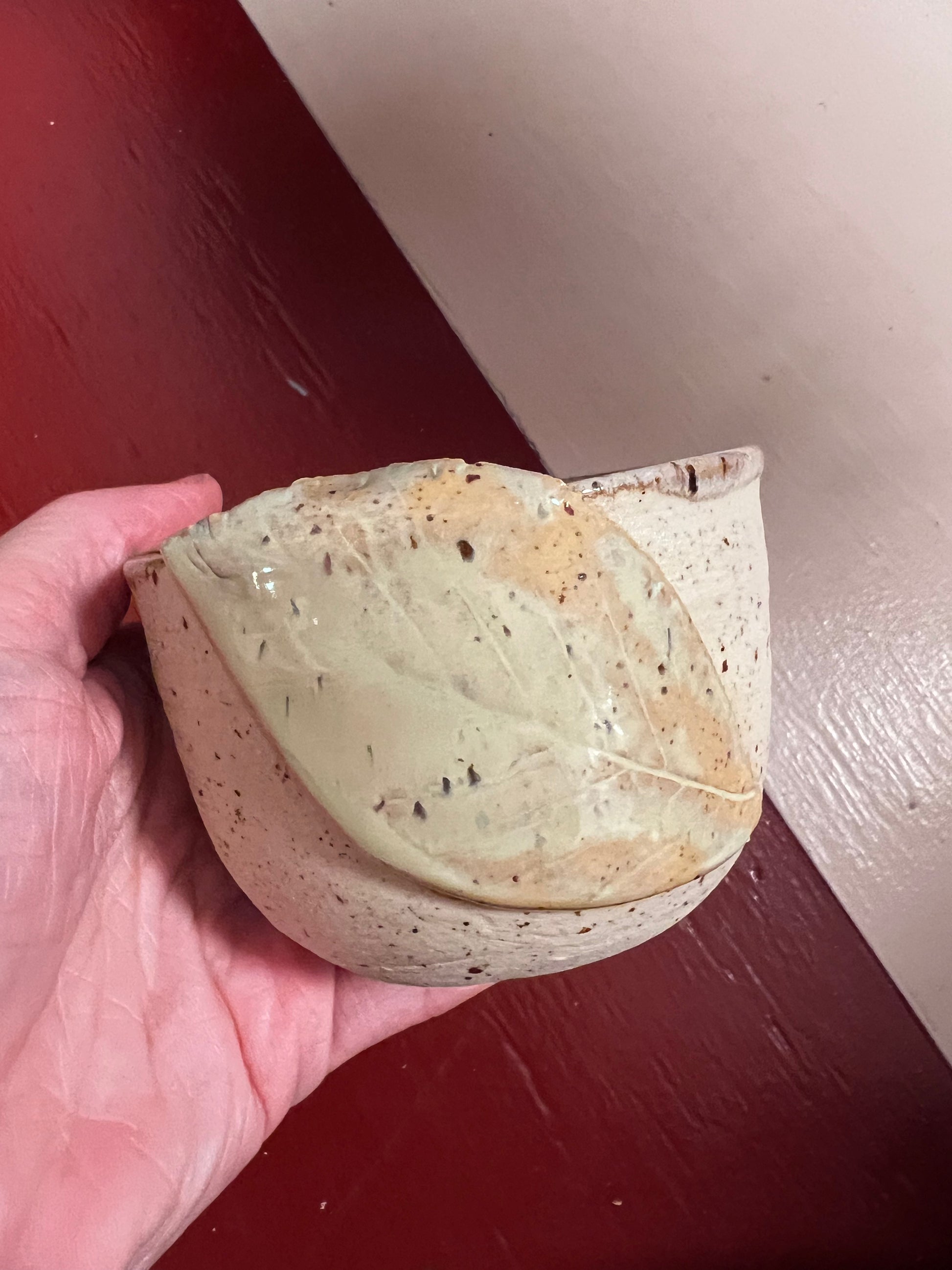 En unik håndlavet keramik-kop med et smukt naturtryk af et blad, der slynger sig organisk hen over koppen som et lille kunstværk. Ydersiden har en rå, spættet sandfarvet struktur, der fremhæver den fine bladrelief og giver koppen et jordnært og harmonisk udtryk. Glasuren på bladet flyder i varme, cremegyldne nuancer, som fremhæver årerne og detaljerne på den mest naturlige måde.