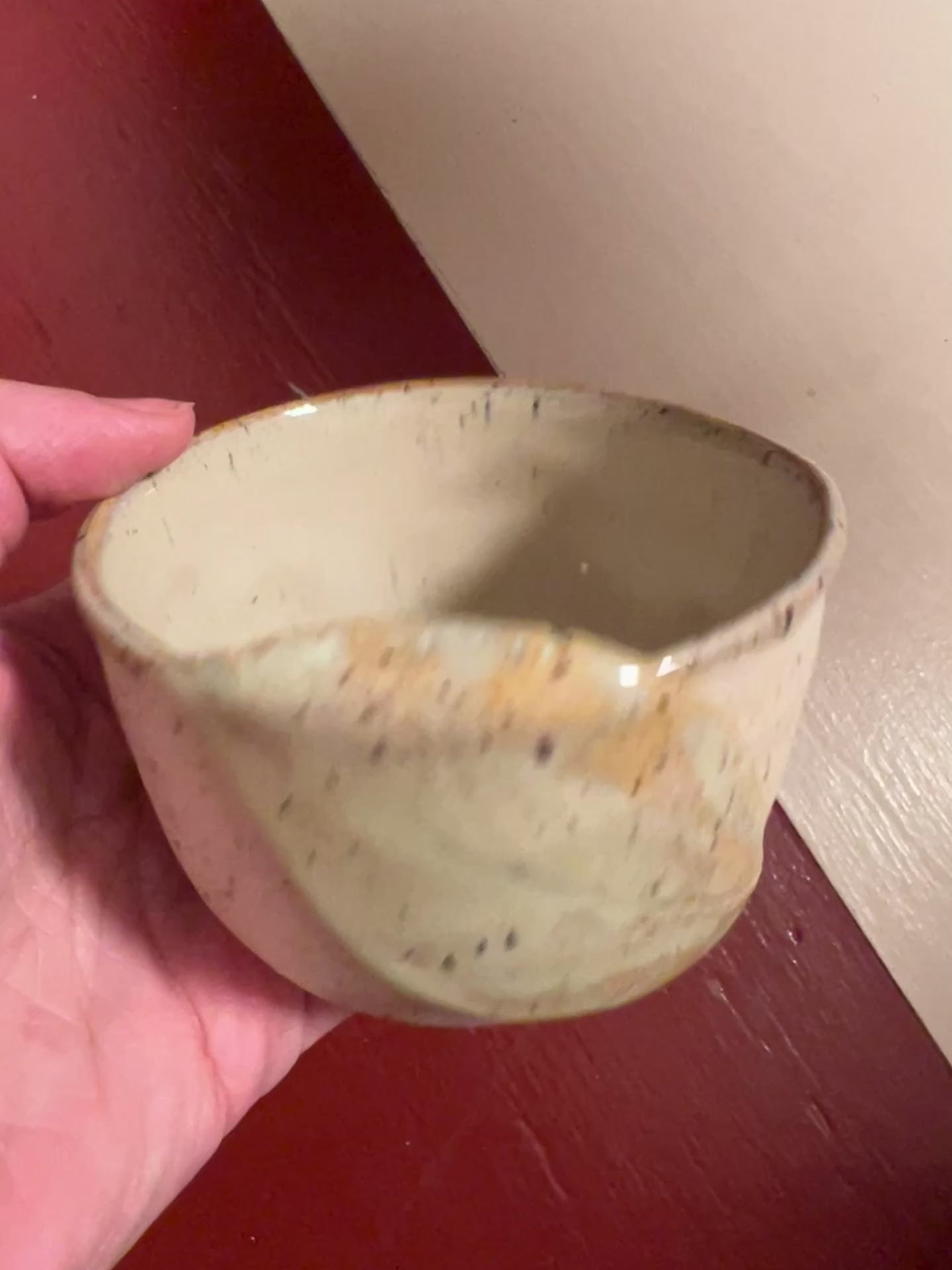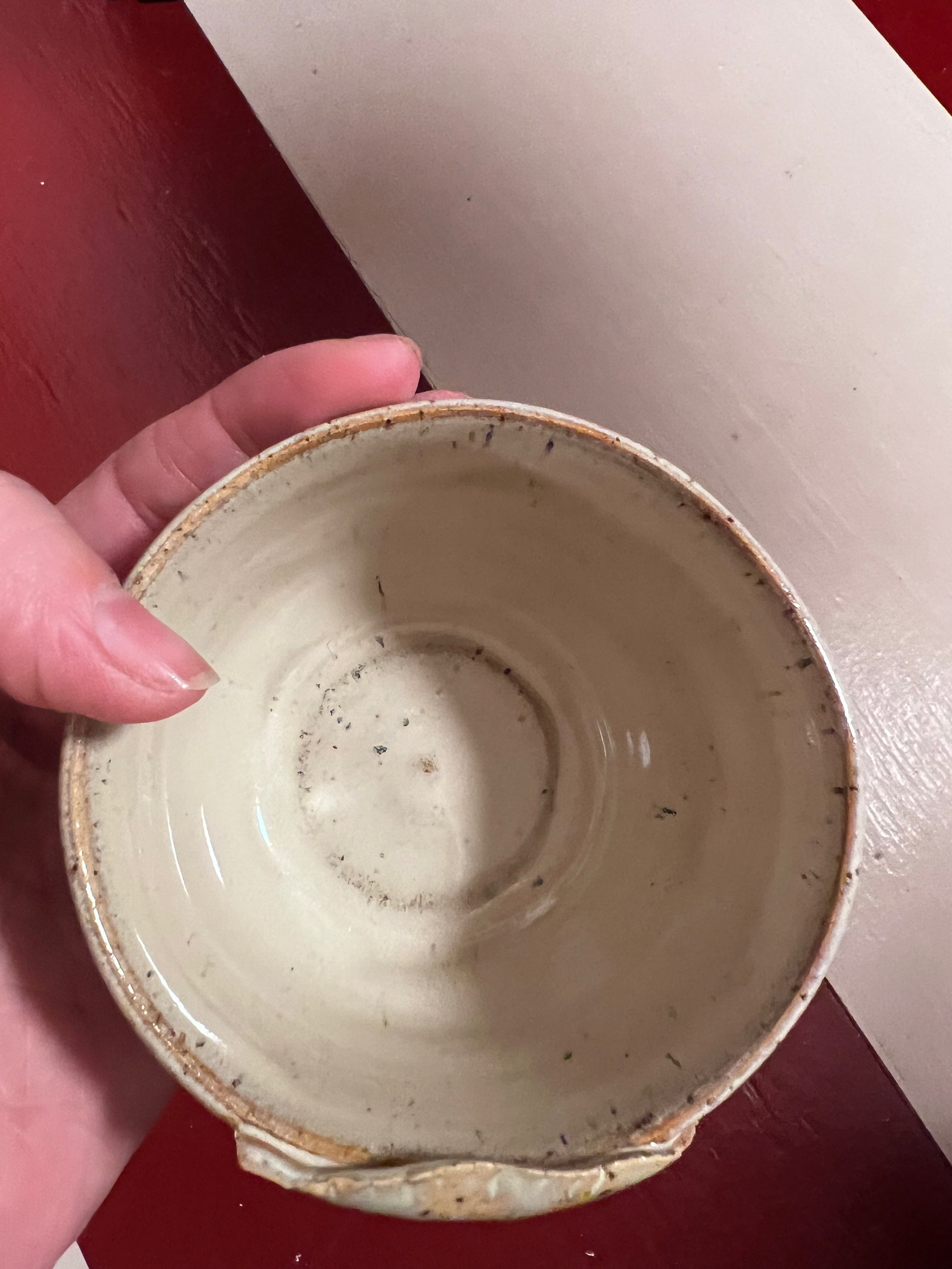 Indersiden er glaseret i en rolig, lys beige tone med et diskret spil af speckles, der giver dybde uden at tage fokus fra det smukke ydre. Formen er blød, organisk og ligger perfekt i hånden – præcis som en håndlavet kop skal.