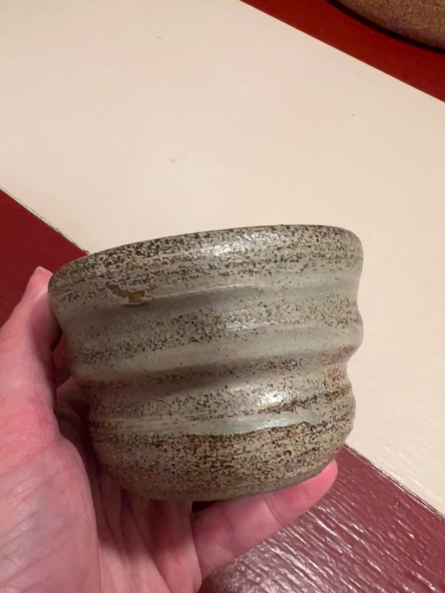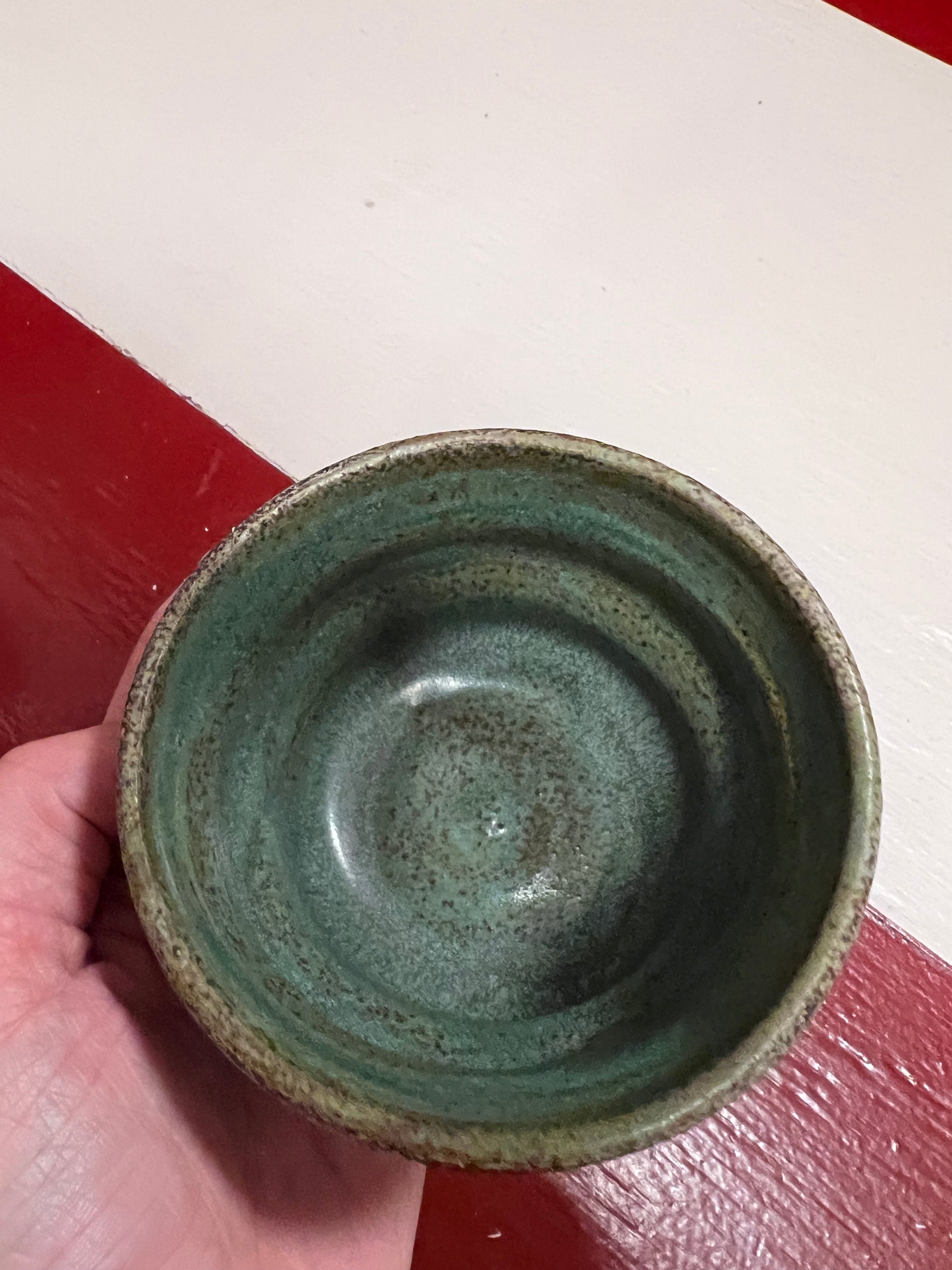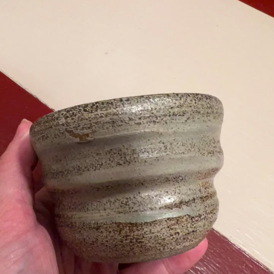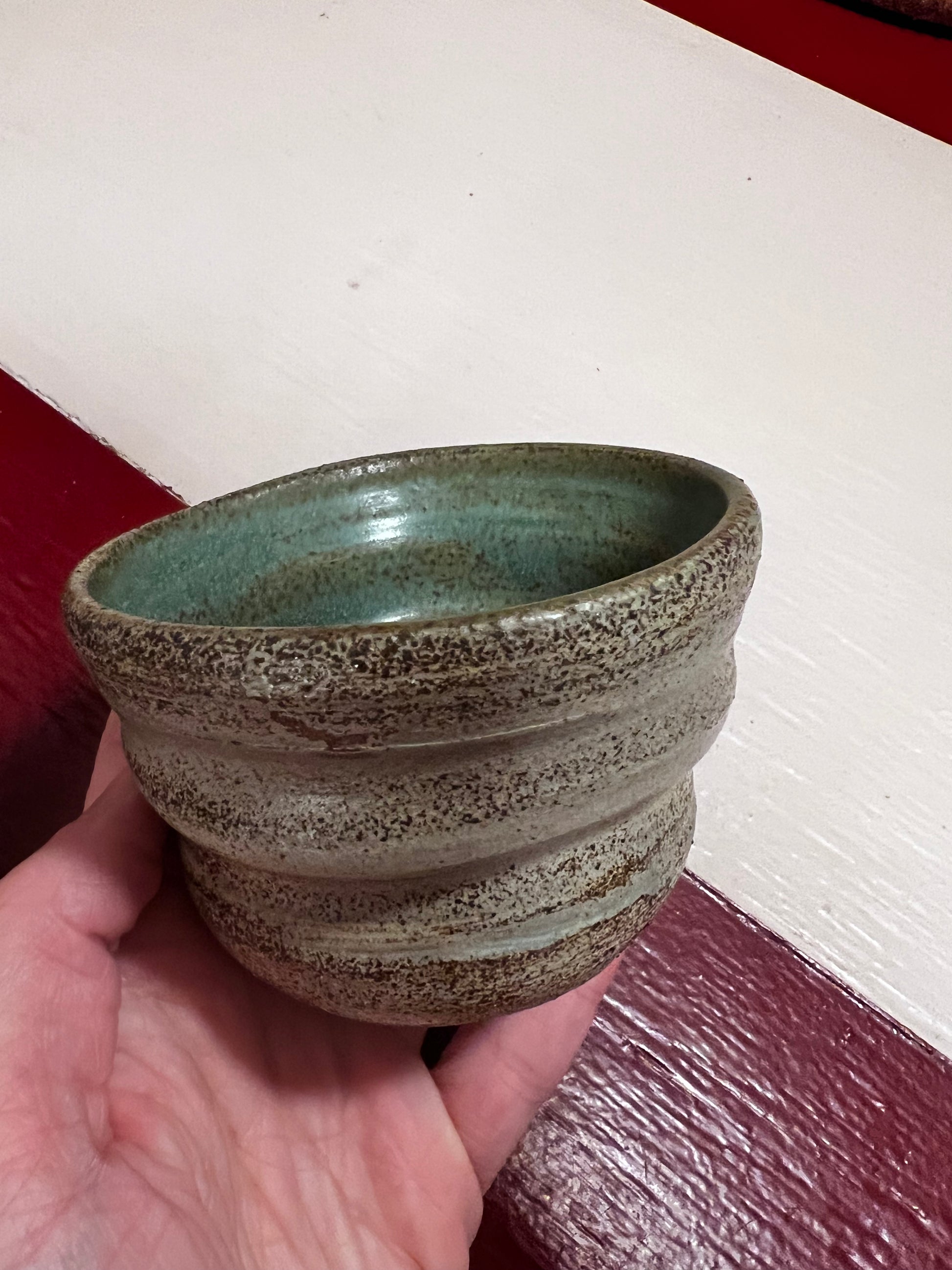 En rå og karakterfuld skål med hånddrejede, bølgende ringstrukturer på ydersiden, der giver et organisk og næsten geologisk udtryk. Den dybe, mosgrønne glasur indvendigt spiller smukt op mod den sandfarvede, let rustikke yderside – som et lille stykke natur formet i ler.