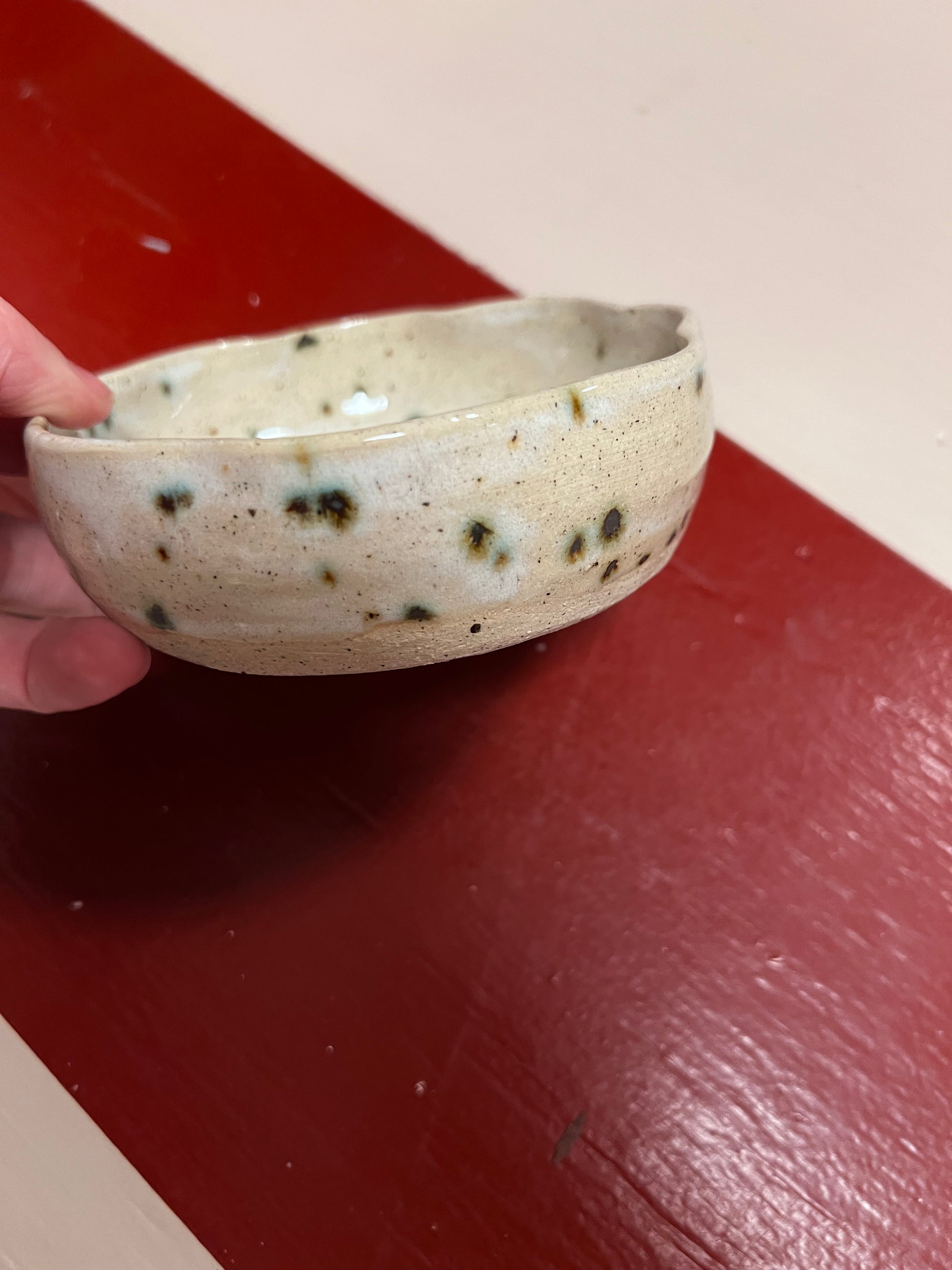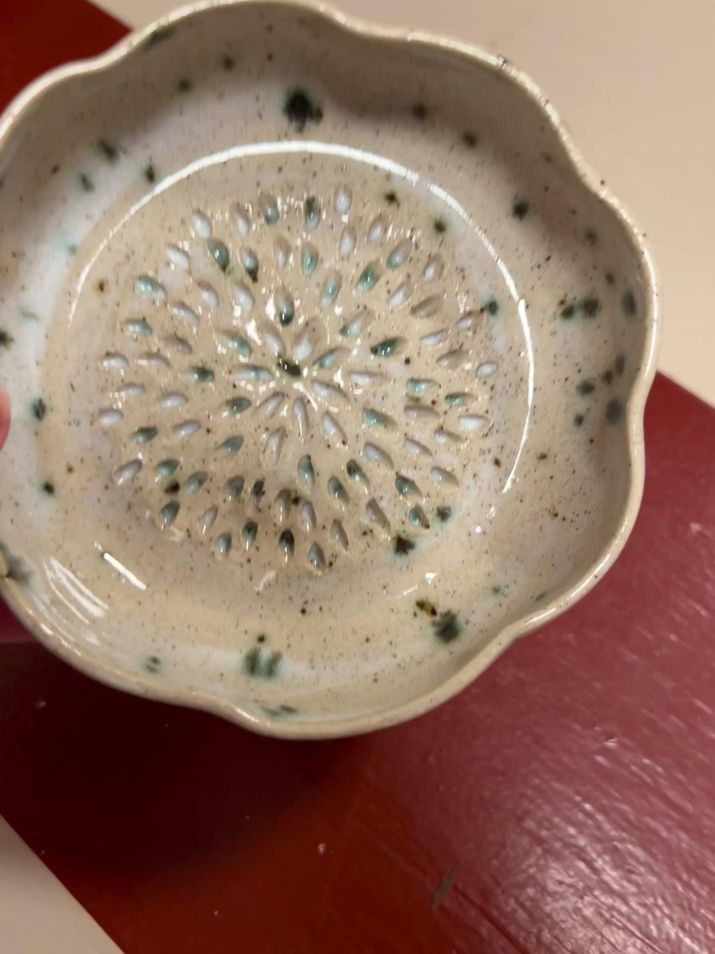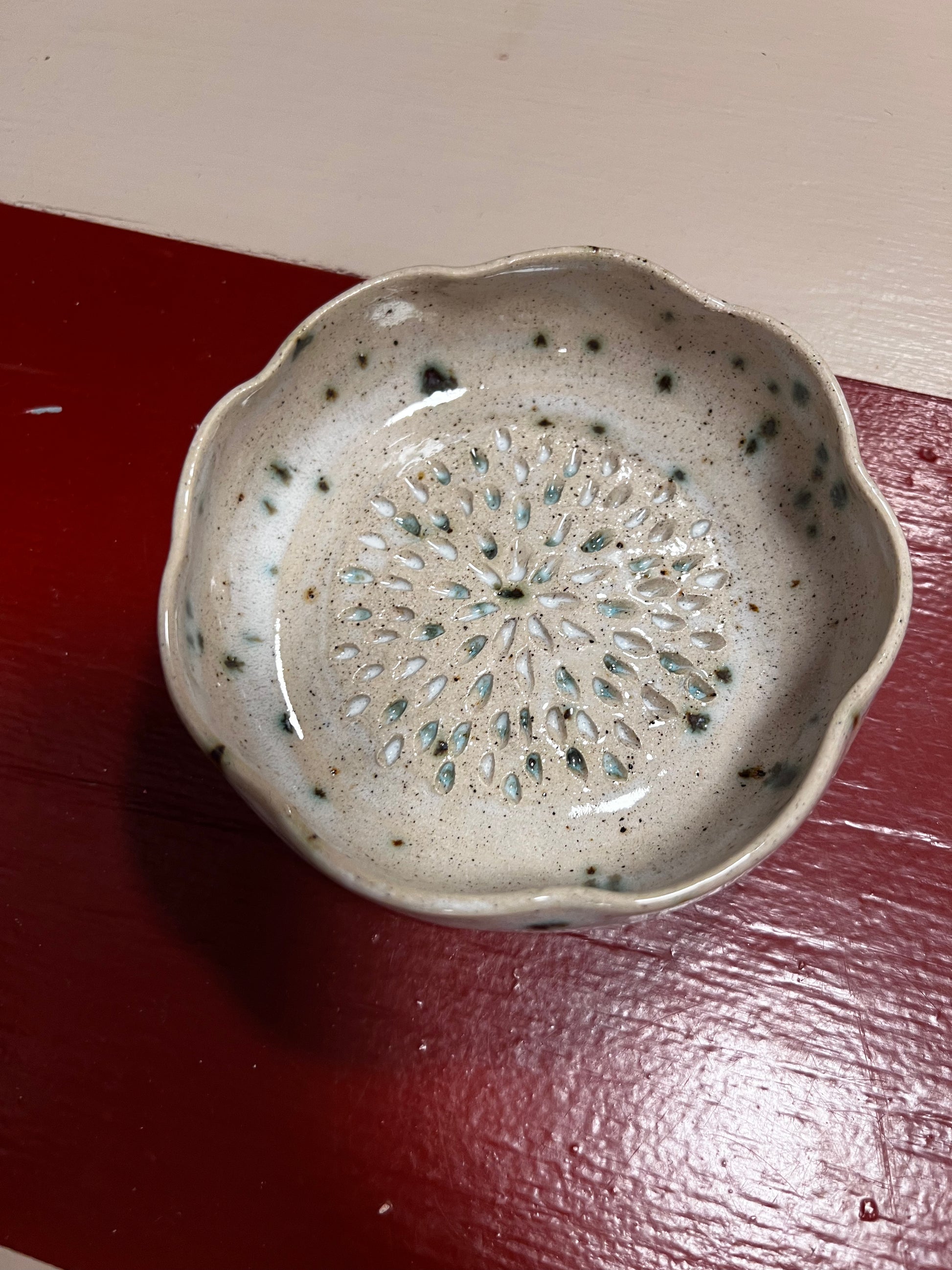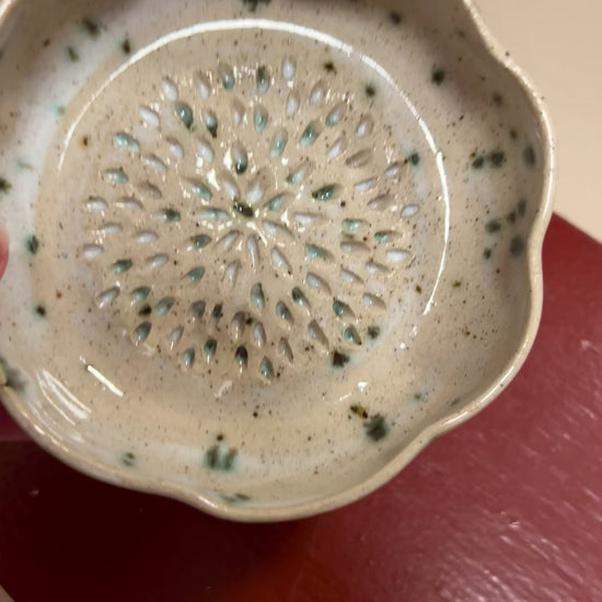 En hånddrejet riveskål i lyse, nordiske nuancer med små grønne og brune prikker, der giver et levende, organisk udtryk. Formen er blødt bølget hele vejen rundt, og midten er udstyret med de fine, håndlavede rivenopper – perfekte til hvidløg, ingefær, citrus eller små dressinger.